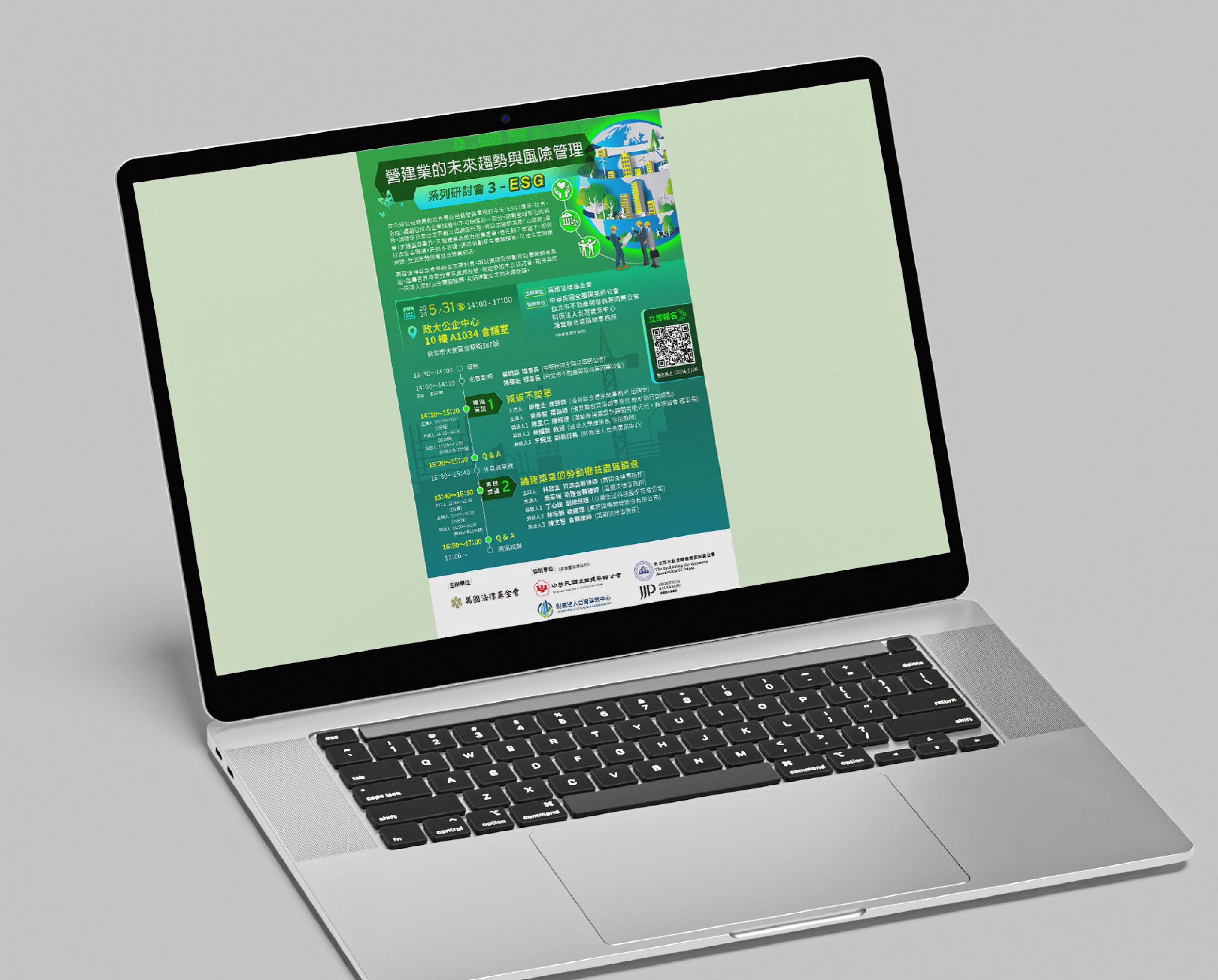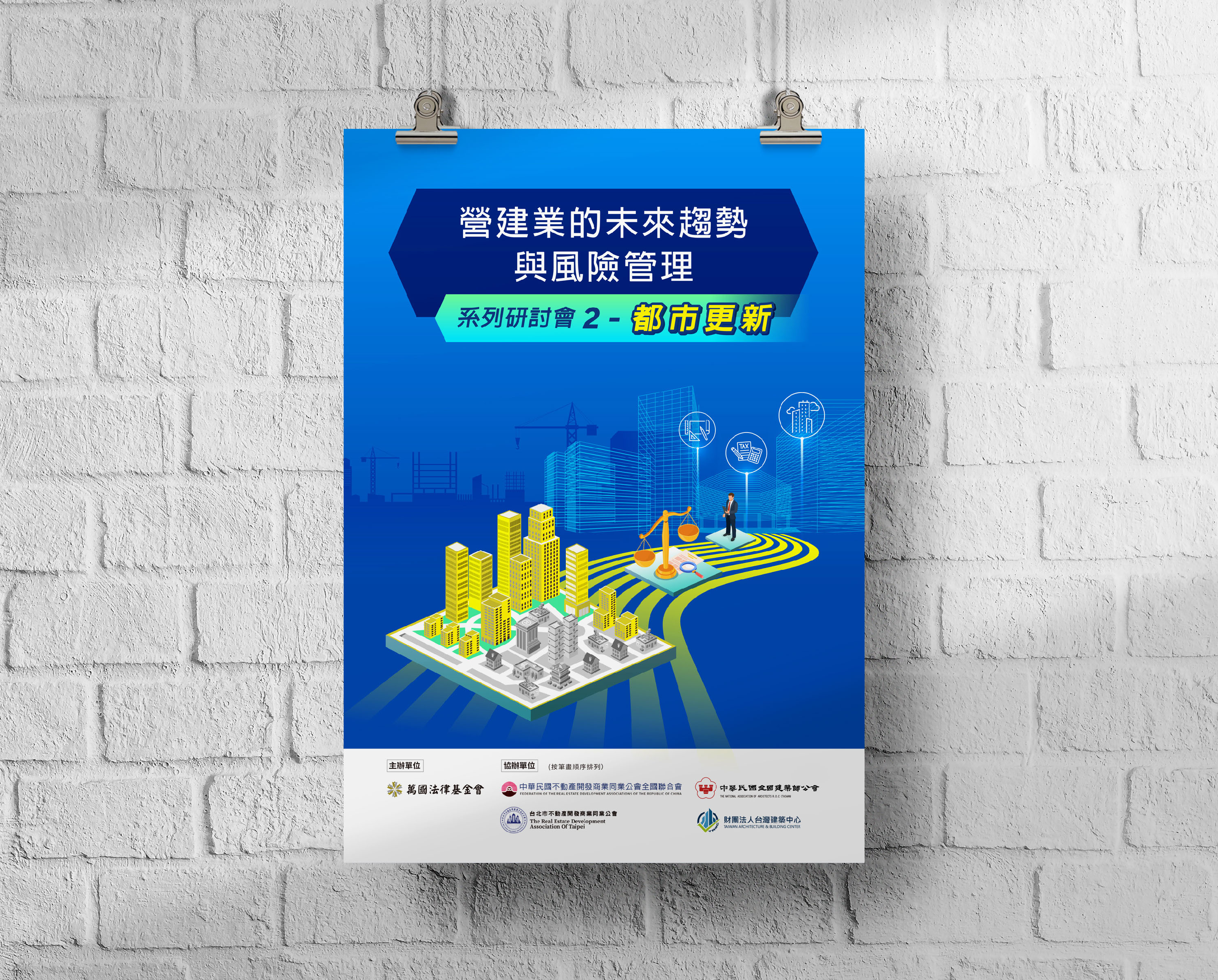 「營建業的未來趨勢與風險管理」共有3場研討會,主視覺均與建築相關,以系列化方式設計,強調風險管理與前瞻未來,手法表現上均有用到立體化的小元素襯托未來感。顏色的選擇則是以配合主題為主。