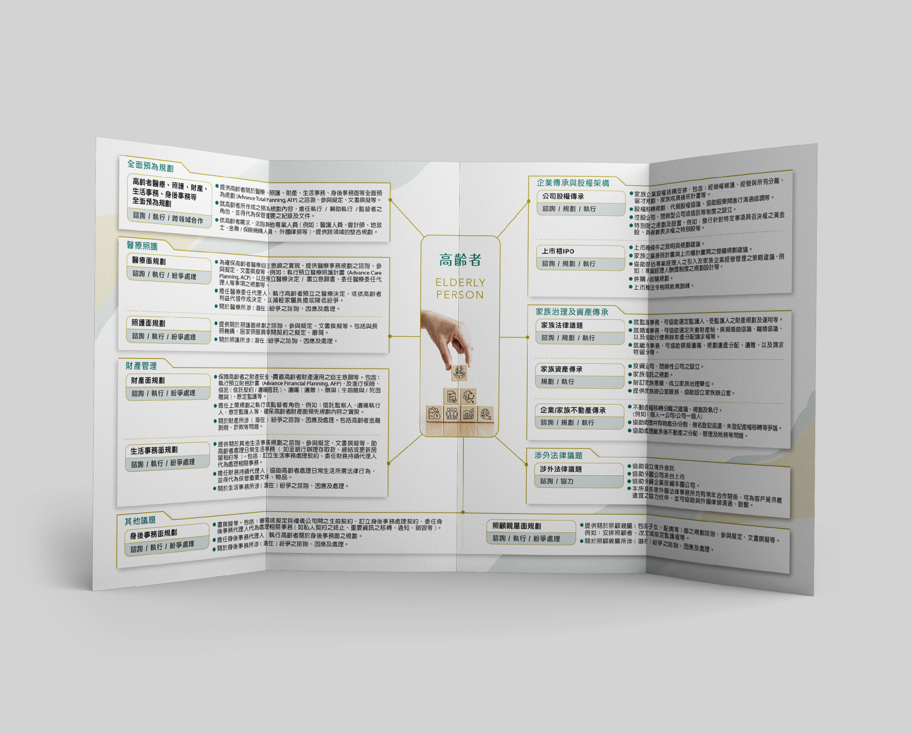 設計概念 高齡的社會趨勢,法律與之關係將日益增加,為呈現多面向,封面以抽象的圖素,表達減少針對性增加了更多彈性開放的感覺,色系以穩重的「綠」為主,輔以「金色」顯示出尊重與重視,內頁以中心向外放射的方式呈現開闊的氛圍。