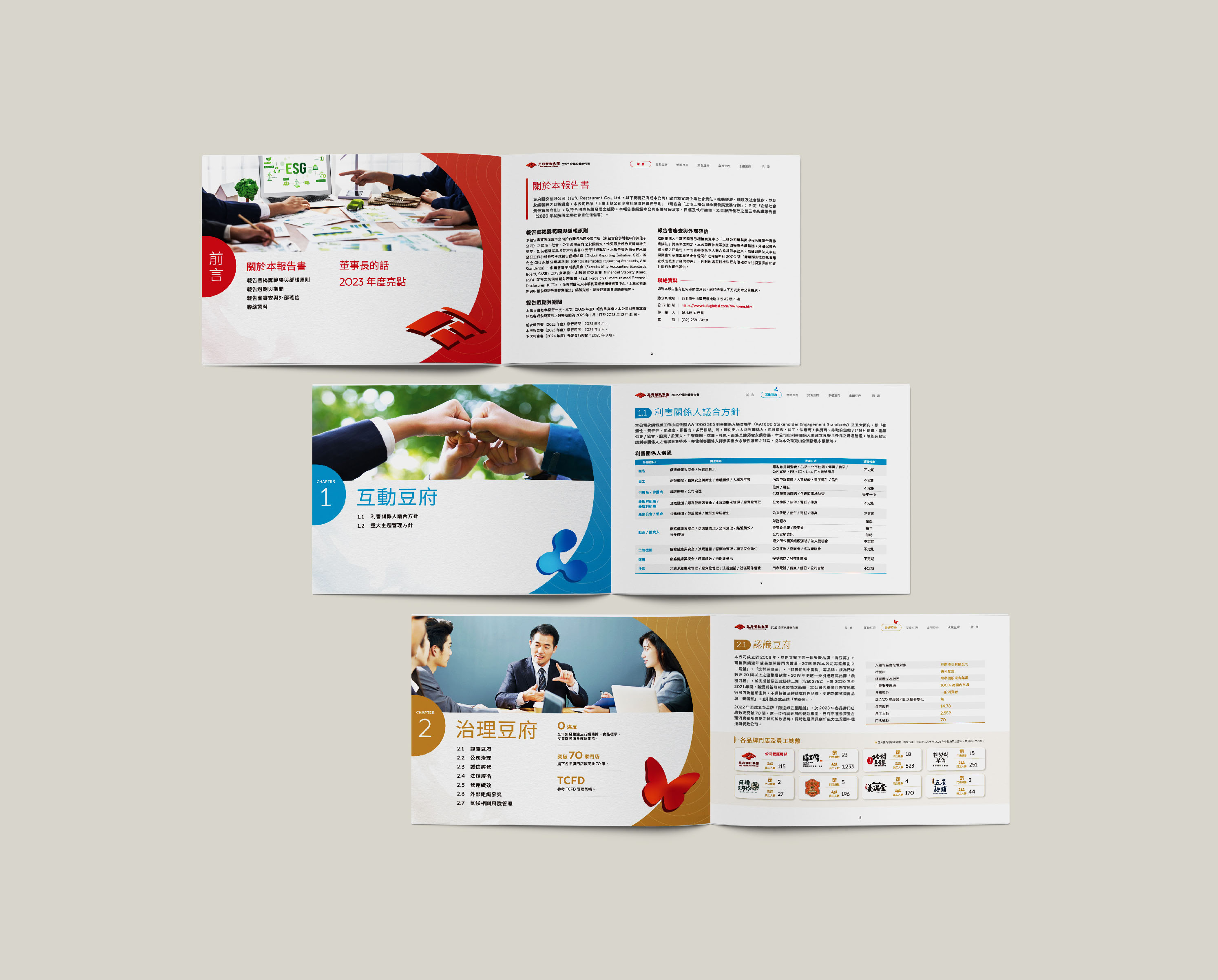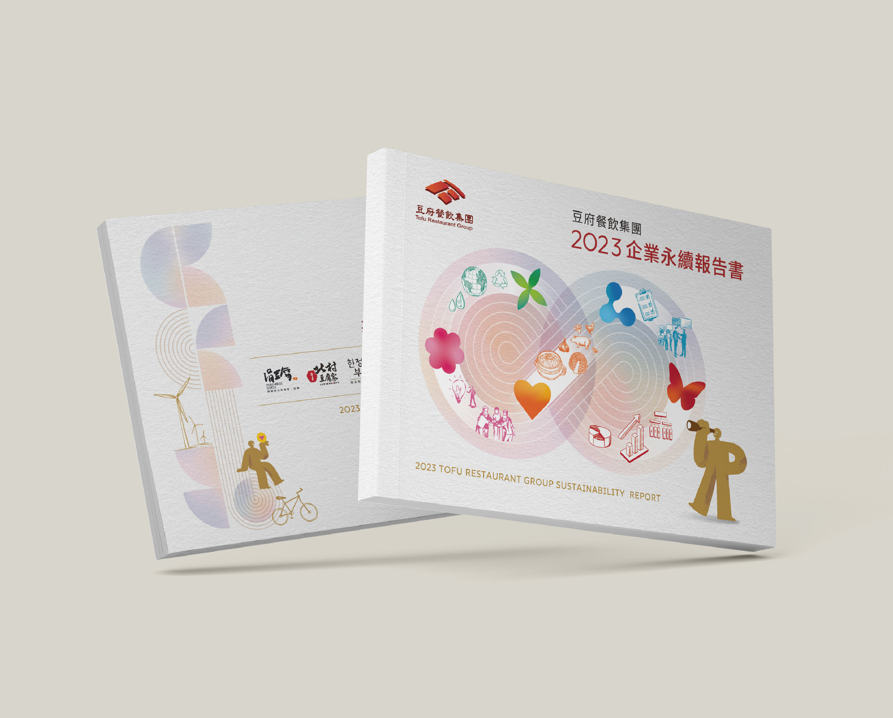 設計結合「無限」與「循環經濟」的概念,「豆府餐飲集團」資源能不斷循環、創新、發展來展現企業韌性,不斷創造新的價值與對環境責任的無限承諾,達成營收成長與環境保護的雙贏,以插畫風與水彩風格的背景來表現友善。